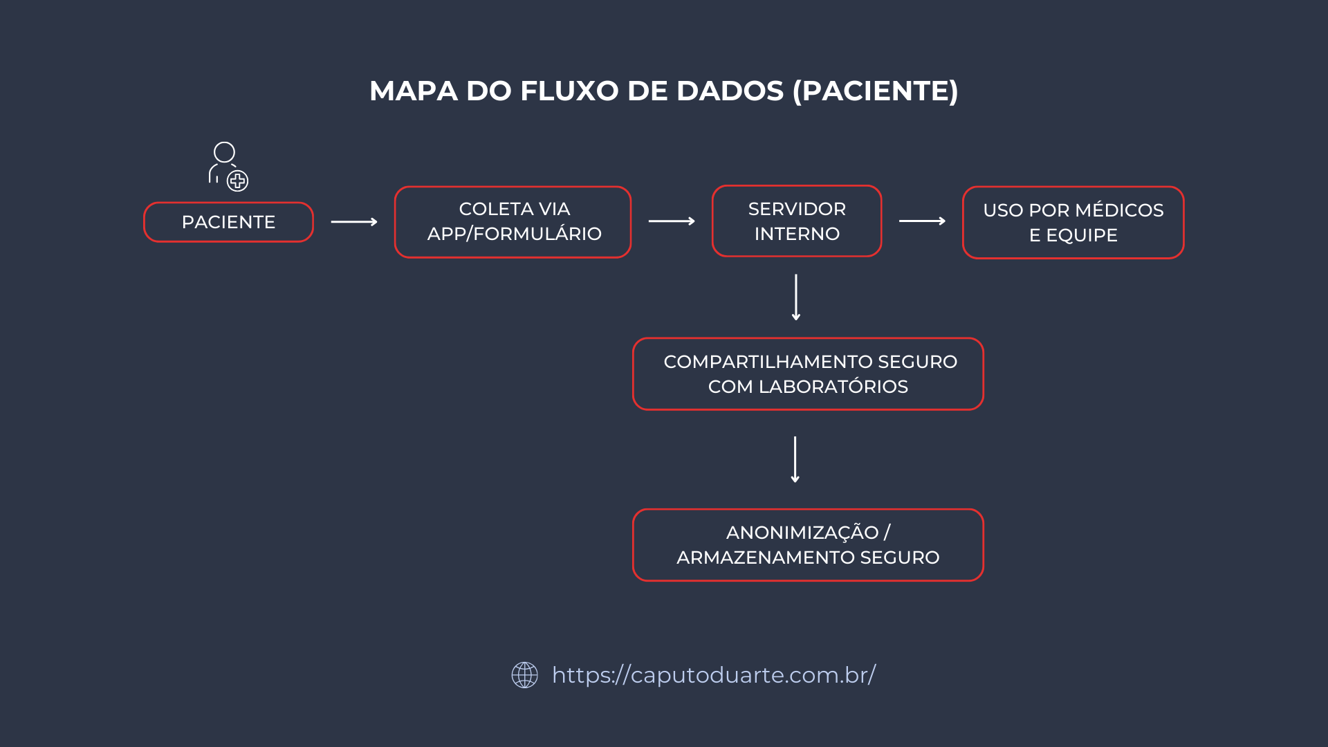 Uma dica prática é criar um mapa visual do fluxo de dados, que facilite a visualização e o acompanhamento de cada ponto do tratamento de dados na sua startup. Exemplo: